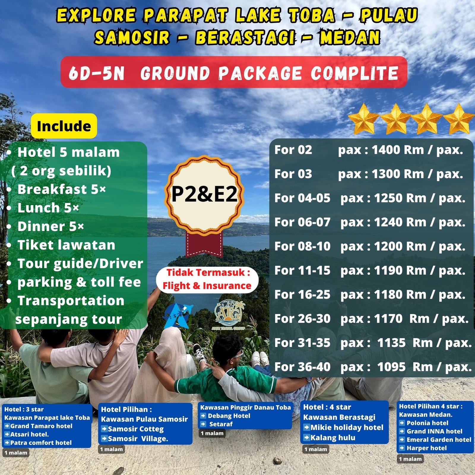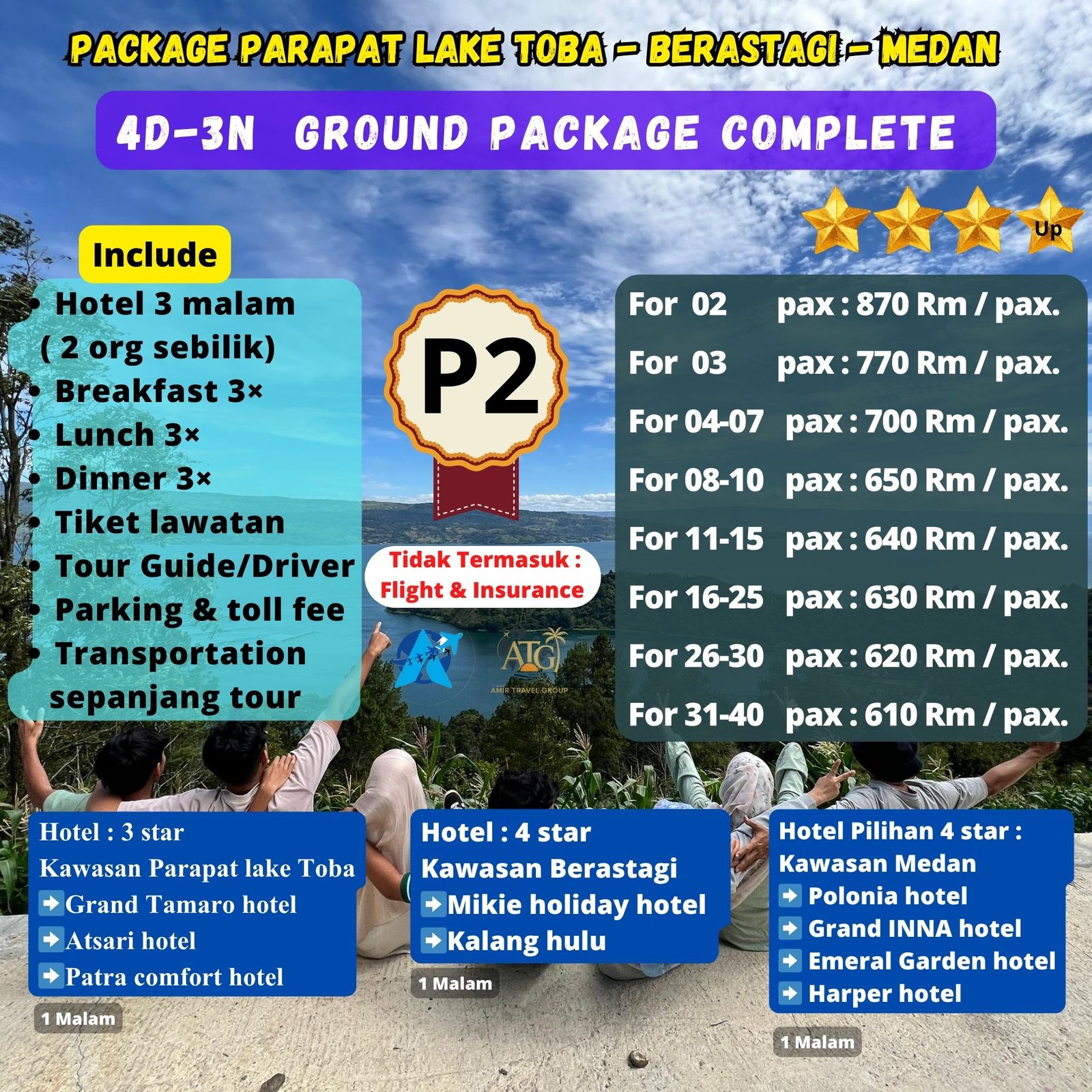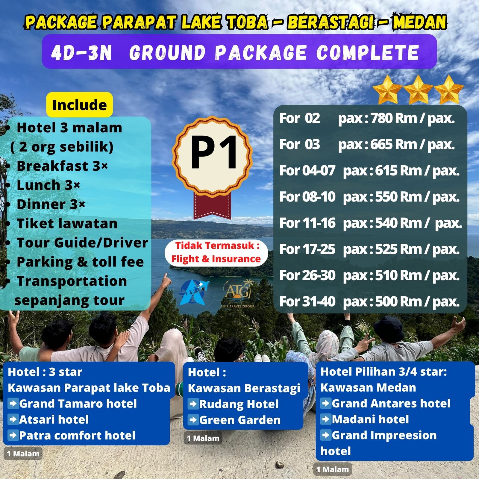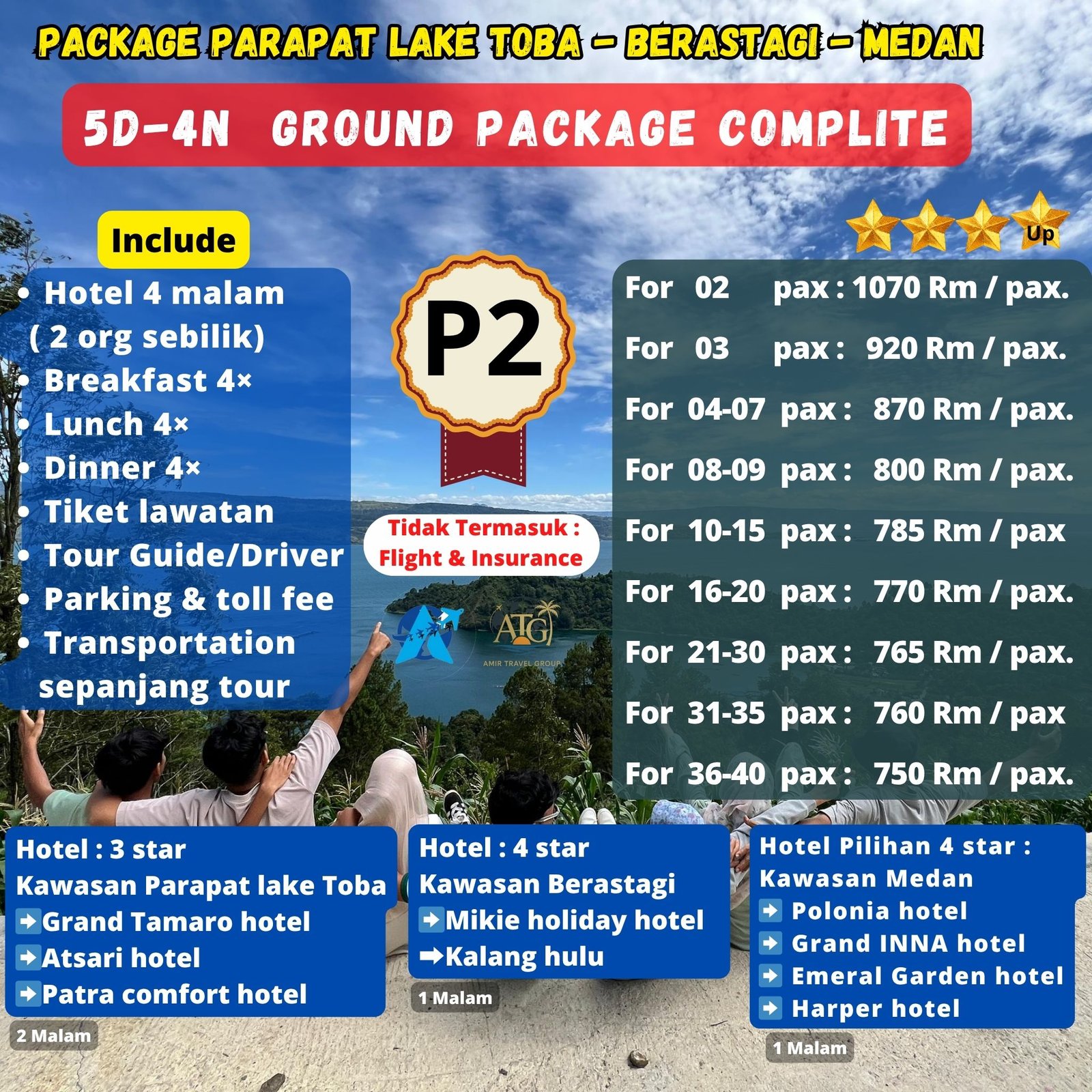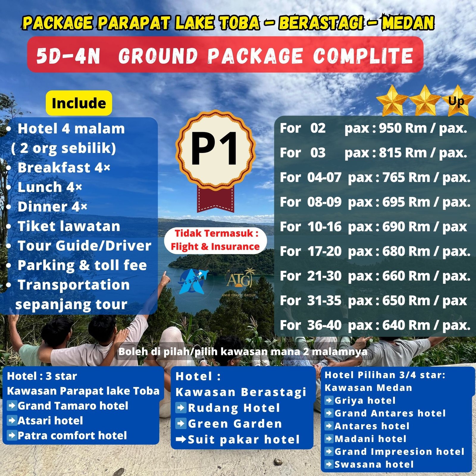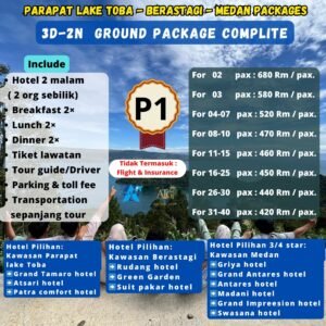 Pebedaan dari Harga Package P1 Dan P2 di sebabkan hotel di dua kawasan, kawasan Berastagi dan kawasan Medan dengan itinerary yang sama.