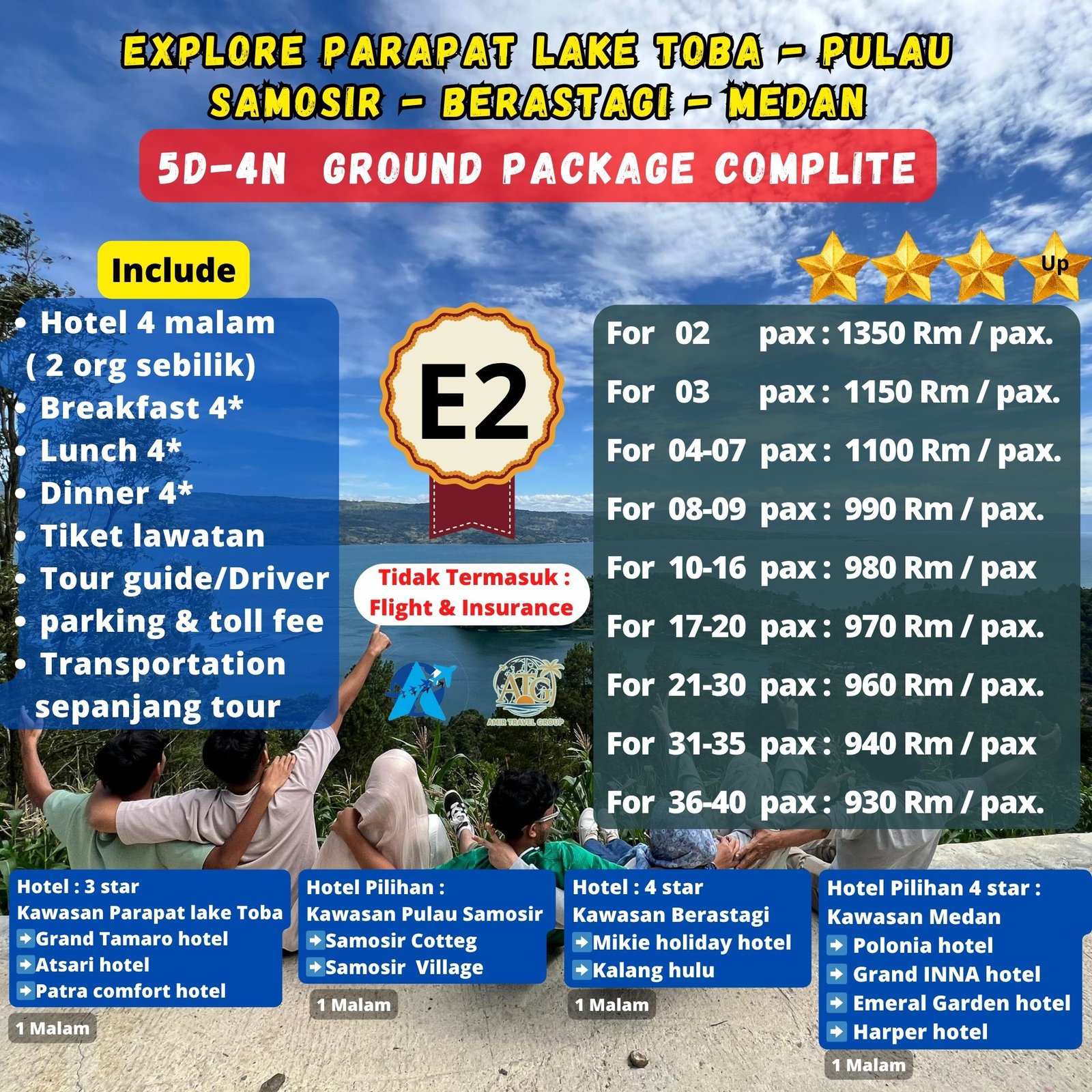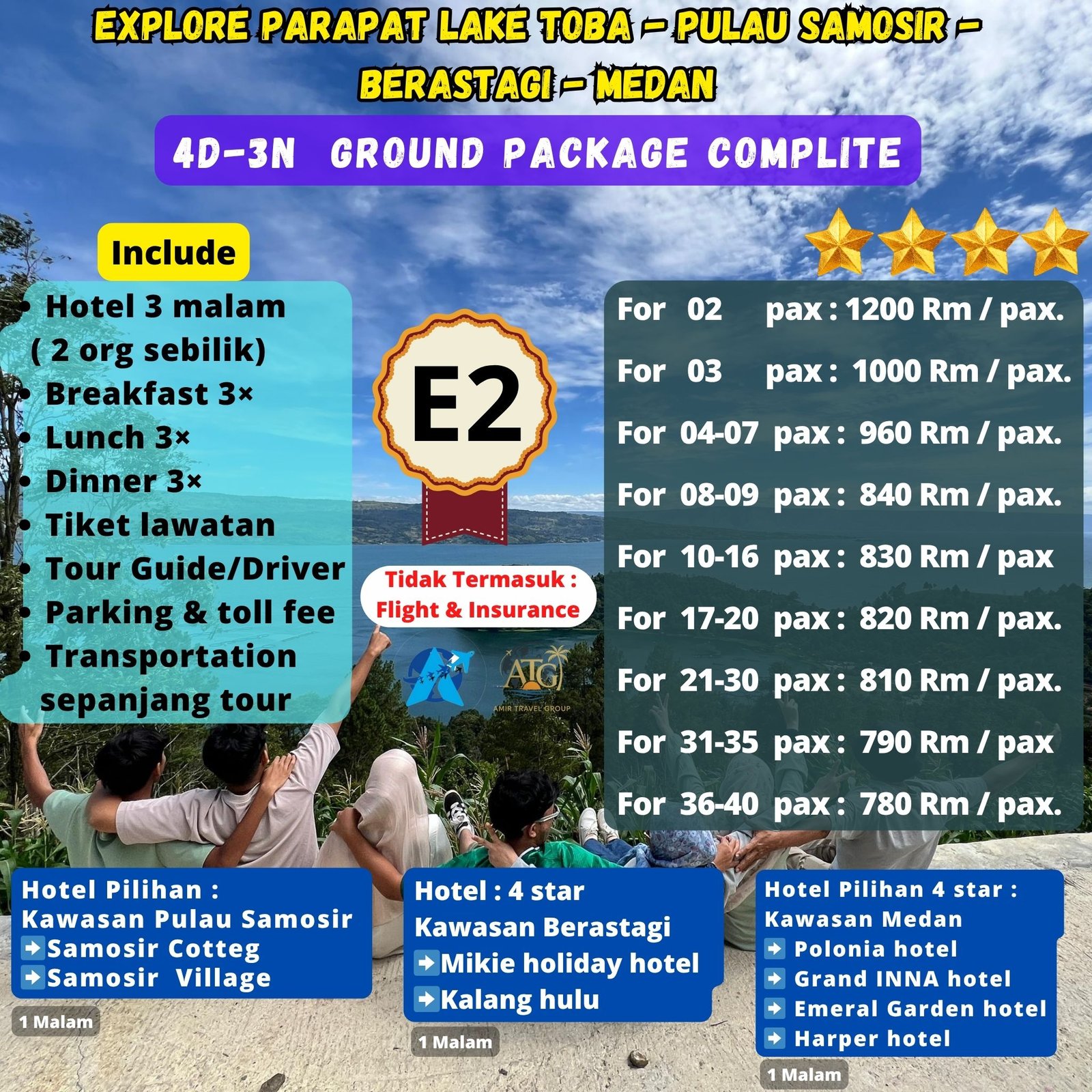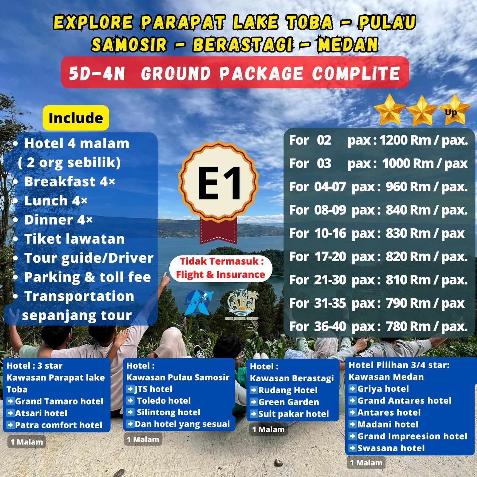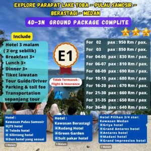 Dan perbedaan harga package E1 & E2 di karenakan ada tambahan program/kunjungan dan 1 malam /hotel di kawasan pulau samosir dan Pebedaan dari Harga Package E1 Dan E2 di sebabkan hotel di dua kawasan, kawasan Berastagi dan kawasan Medan dengan itinerary yang sama.
